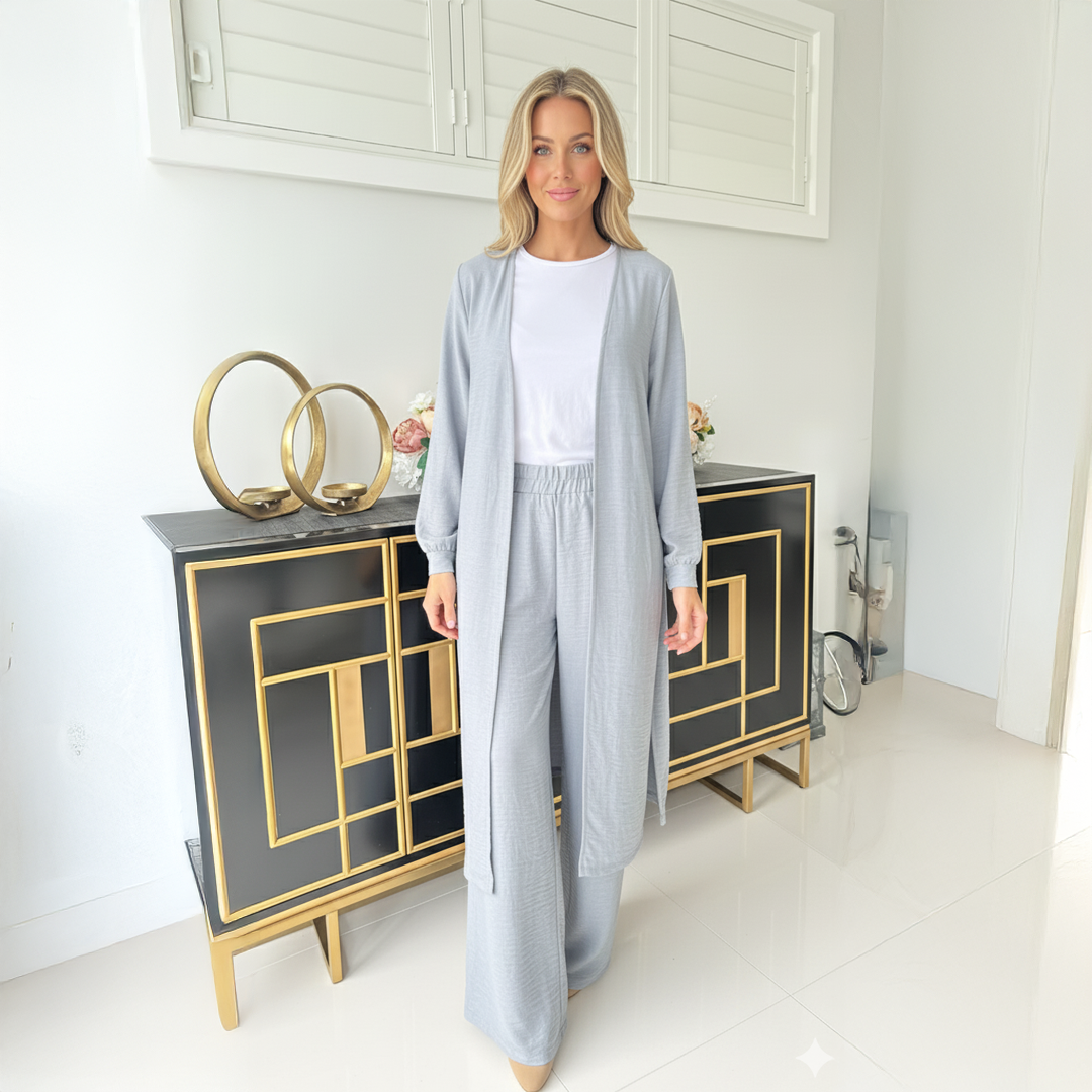 Relaxed long-sleeve open cape with a flattering waist tie, this piece drapes beautifully for a refined yet comfortable look. Paired perfectly with elastic waist, high-rise pants.